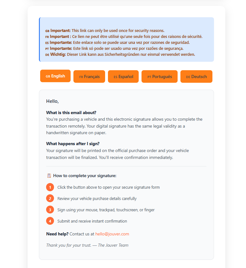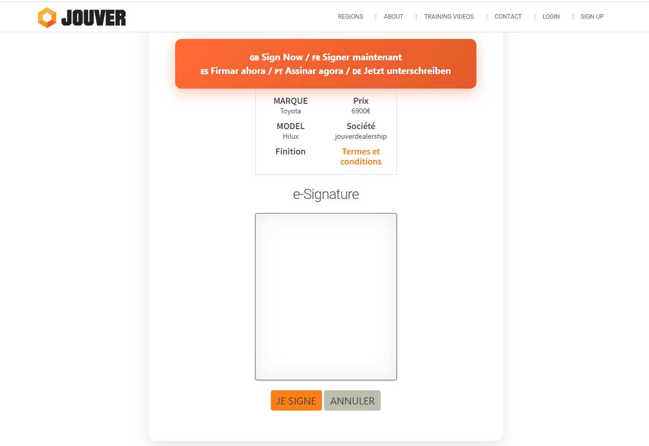 The client will receive a request for esignature by email and will be send on a secured page on Jouver showing the vehcile he is buying from your dealership: