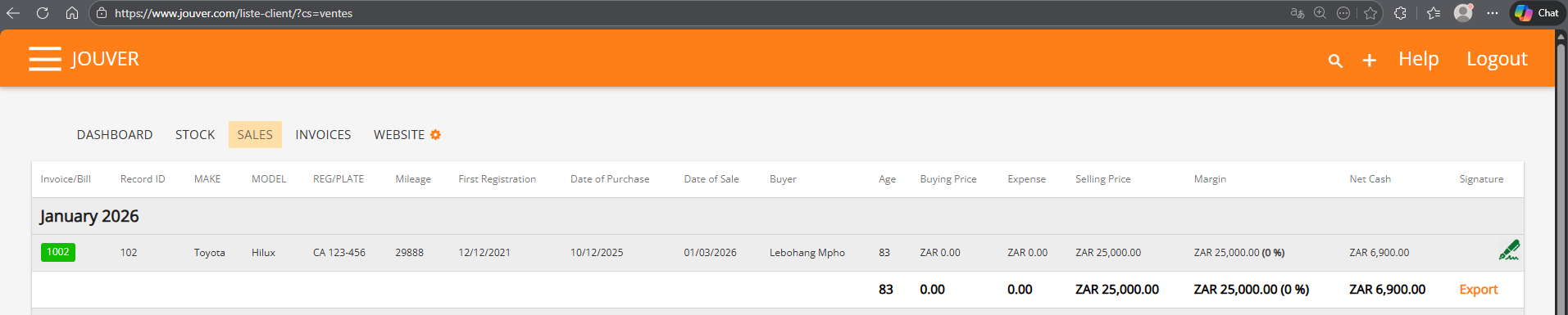Yes. Go to the SALES page and click Export to download sales data in Excel or CSV format. The export includes invoice details, vehicle information, prices, margins, and monthly breakdowns.