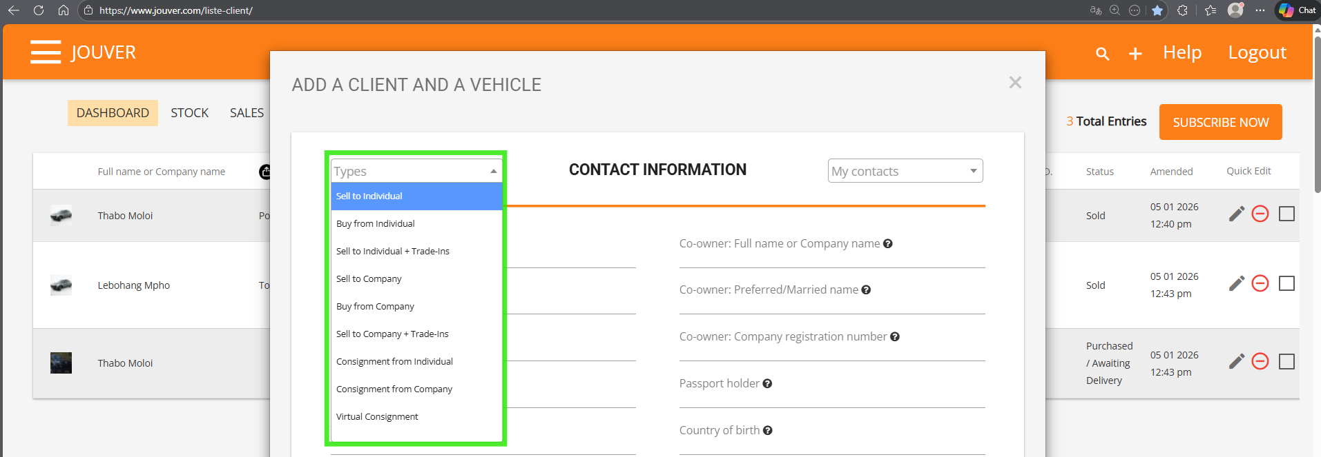 Choose based on: who you're dealing with (individual or company), the transaction direction (buying or selling), whether there's a trade-in, and whether you're purchasing the vehicle or handling it on consignment.
