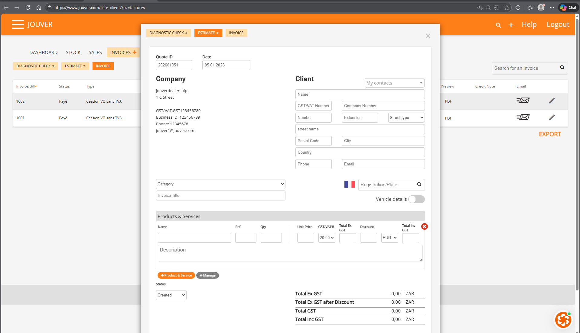 Details: Service invoicing lets you bill for repairs, maintenance, parts, labor, and other services beyond vehicle sales. Access the Invoicing module from your main menu and click the button to create a new invoice. Jouver generates the next invoice number automatically. Start by entering or selecting your customer from your contact database. Then add line items for each service you're charging for. Type a clear description, enter the quantity, set the unit price, and select the appropriate tax rate for that service. You can add as many line items as needed for complex jobs. If offering a discount, enter it as a fixed amount or percentage on any line. As you add items, Jouver calculates running totals for subtotal, tax, and final amount. You can adjust the total invoice amount if needed for rounding, and Jouver will recalculate the pre-tax amount accordingly. Save the invoice and you can immediately print it, download as PDF, or email it to your customer. The invoice includes all your company branding and meets professional standards.