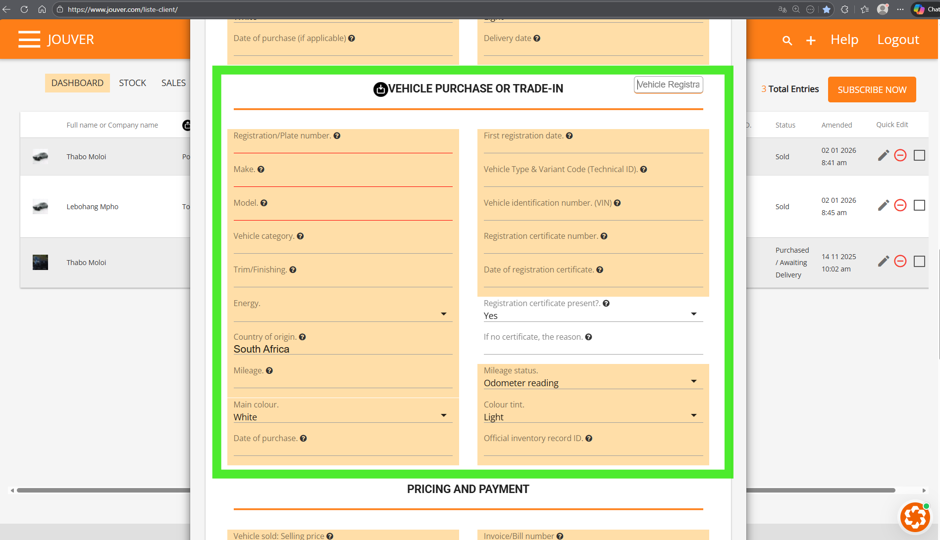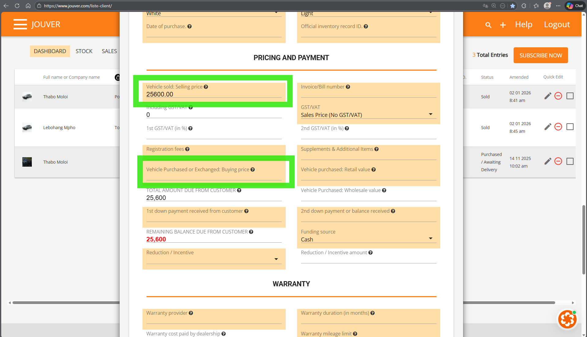 Step 4: In PRICING AND PAYMENT, you should add both: Selling price (vehcile being sold) AND Vehicle Purchased or Exchanged: Buying price.