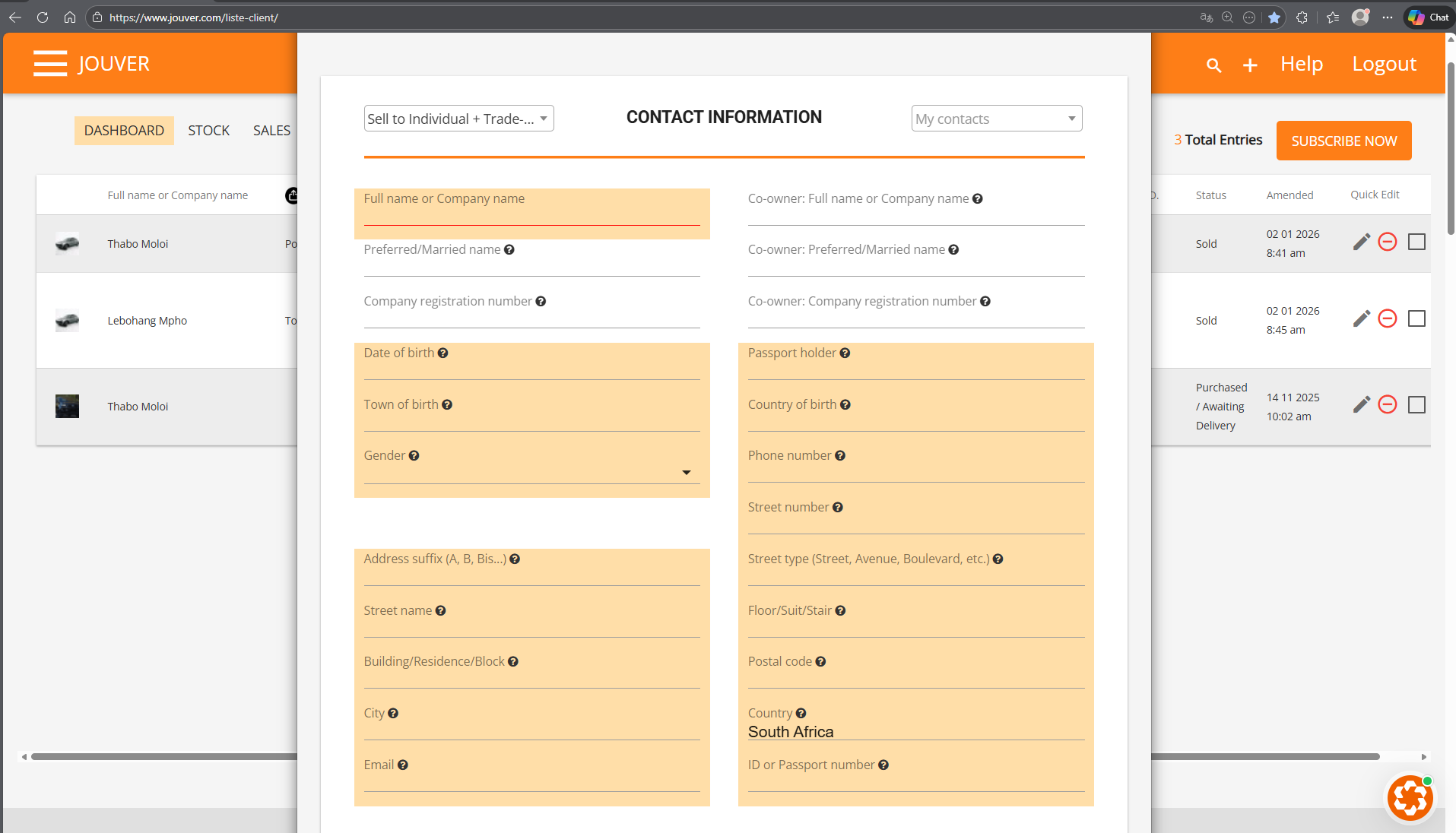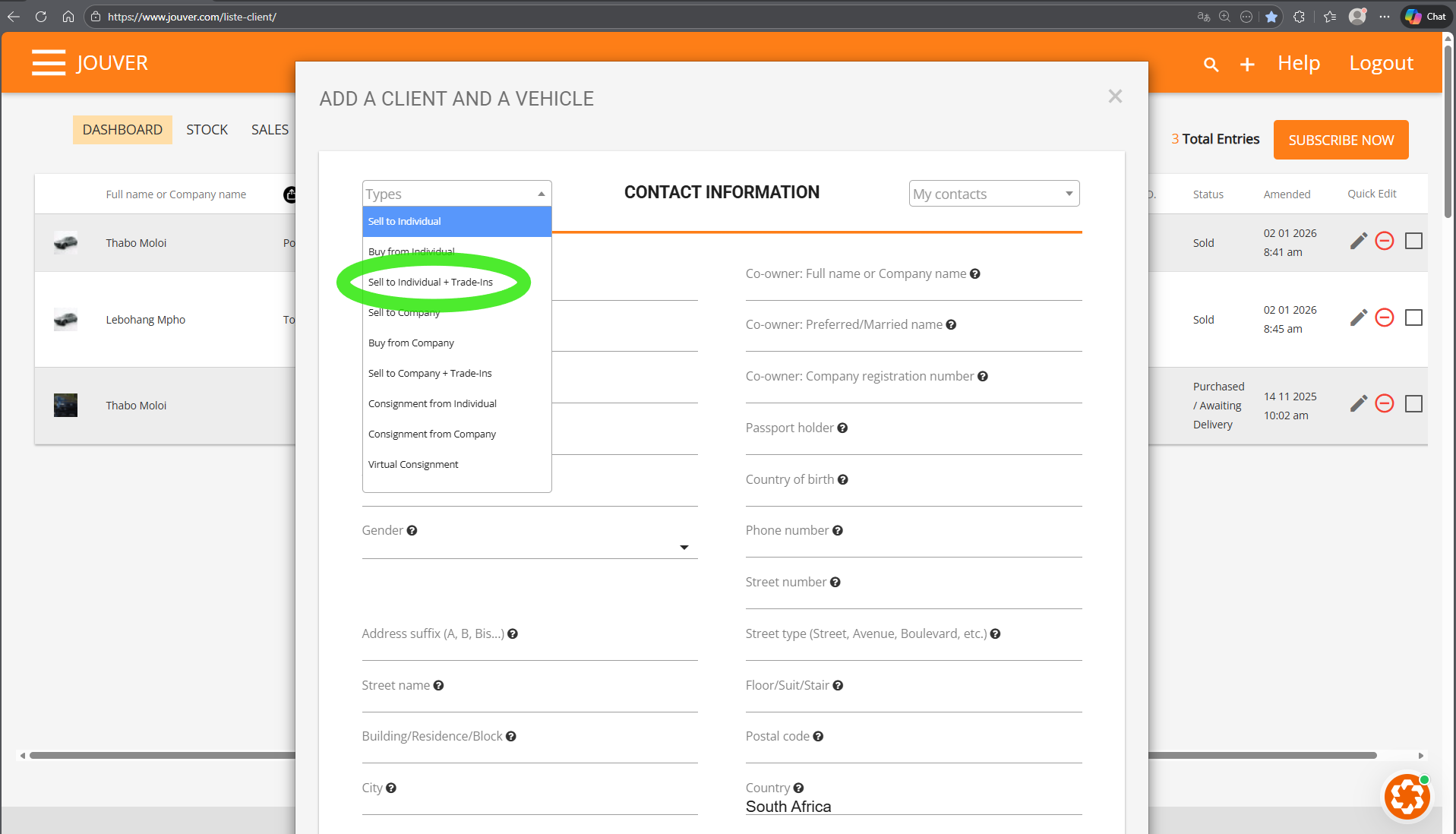 Step 2: Choose the vehicle to be sold from your Stock.