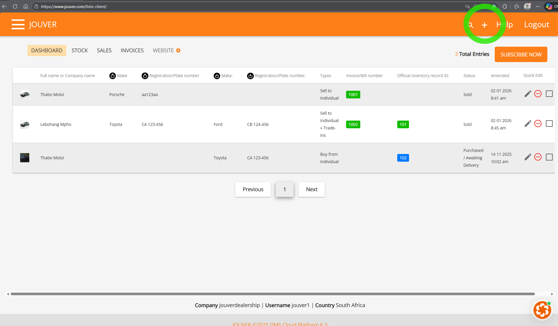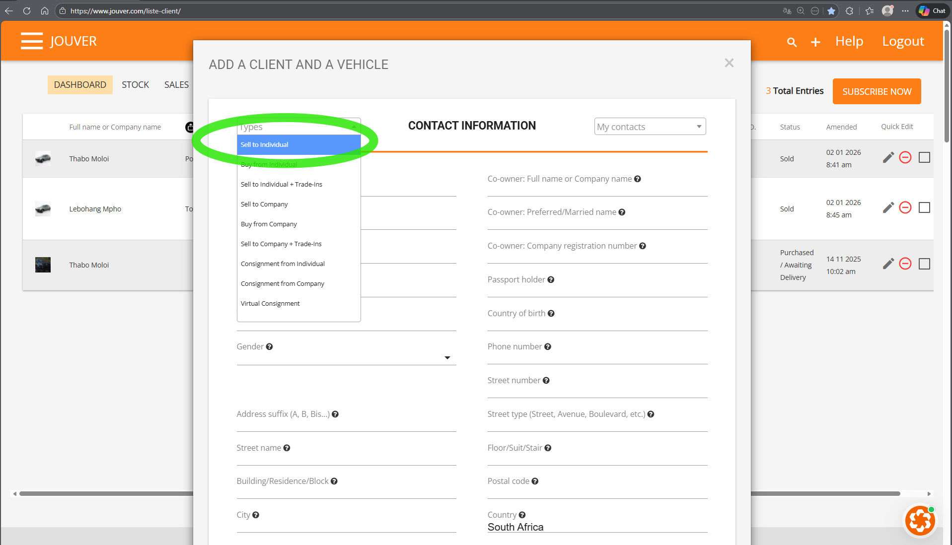 Click the Plus (+) button, select "Sell to individual", choose the client, select the vehicle from stock, verify the selling price, enter any deposit amount, and save. Jouver automatically calculates the remaining balance.