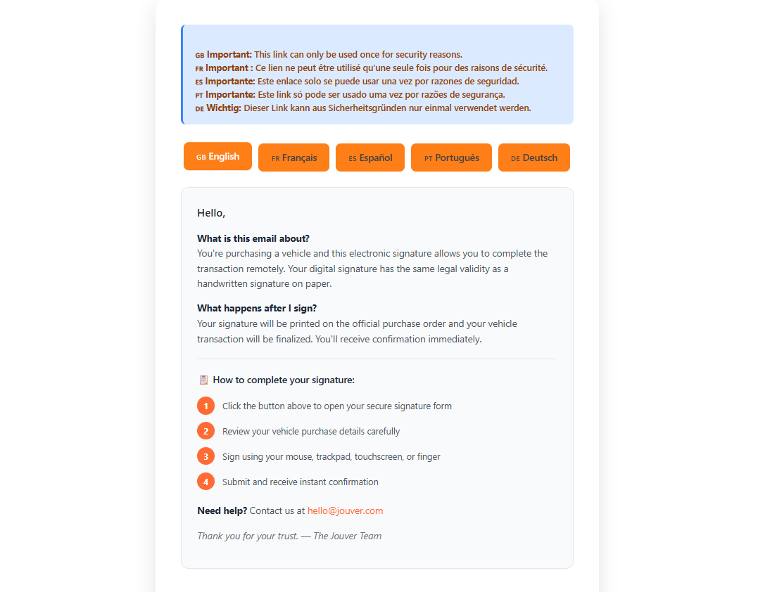 Customer Email: Within minutes, your customer receives the e-signature request email in their inbox. The email comes from your Jouver account and displays your dealership branding.