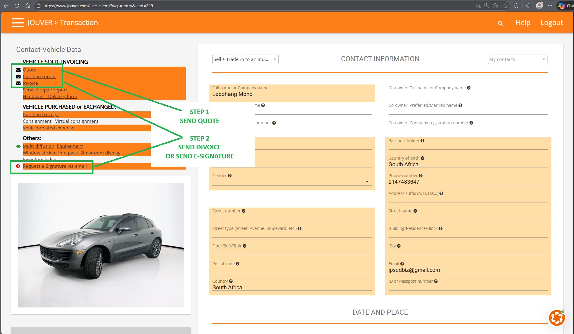 Create the Sale Transaction: Follow the standard process described in "How do I create a quote and send an invoice?" to create your sale transaction. This includes selecting the vehicle from stock, adding customer information, setting the selling price, applying any discounts, and configuring payment terms.